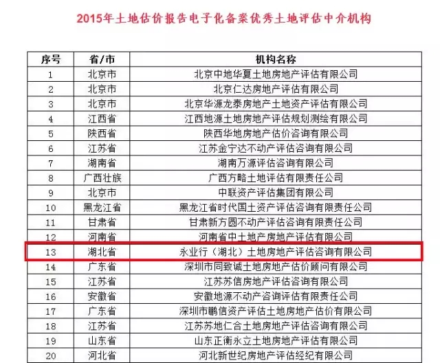 近日,中国土地估价师与土地登记代理人协会(以下简称“中估协”)公布了“2015年土地估价报告电子化备案优秀土地评估中介机构”名单,永业行榜上有名,排名湖北省第一,全国第十三。据悉,2015年,全国共有3059家机构向中估协进行了报告备案,经对备案报告数量、面积、评估额和评估收费等参数进行评定,最终有100家土地评估中介机构获此殊荣。