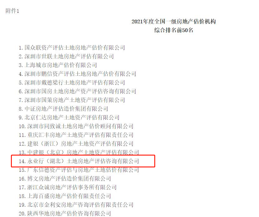 2022年3月30日,中国房地产估价师与房地产经纪人学会发布了《关于发布2021年度全国一级房地产估价机构排名结果的公告》(中房学〔2022〕9号),公告显示永业行在全国952家一级房地产估价机构中名列前茅!