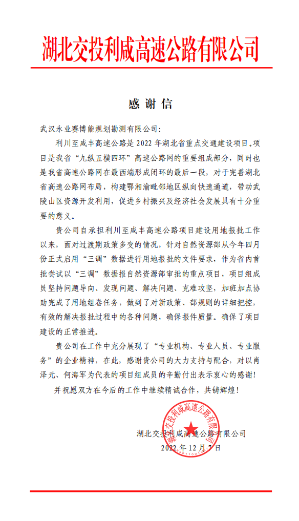 感谢信称,永业行自承担利川至咸丰高速公路项目建设用地报批工作以来,面对过渡期政策多变的情况,针对自然资源部从今年四月份正式启用“三调”数据进行用地报批的文件要求,作为省内首批尝试以“三调”数据报自然资源部审批的重点项目,项目组成员坚持问题导向、发现问题、解决问题、克难攻坚,加班加点协助完成了用地组卷任务,做到了对新政策、部规则的详细把控,有效的解决报批过程中的各种问题,确保报件质量,确保了项目建设的正常推进。对我司及项目组人员在该项目报批工作的表现予以充分肯定。