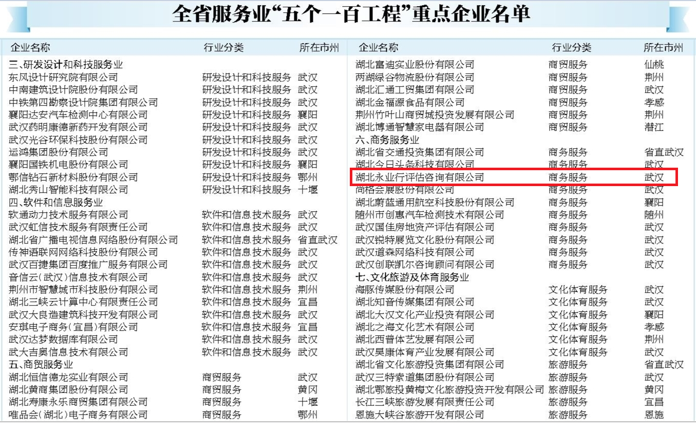 近日,湖北省服务业工作领导小组公布了全省服务业“五个一百工程”重点企业、重点品牌、示范园区名单,永业行获认定为湖北省服务业重点企业、重点品牌。这是继2014年以来,永业行再度获此两项殊荣。