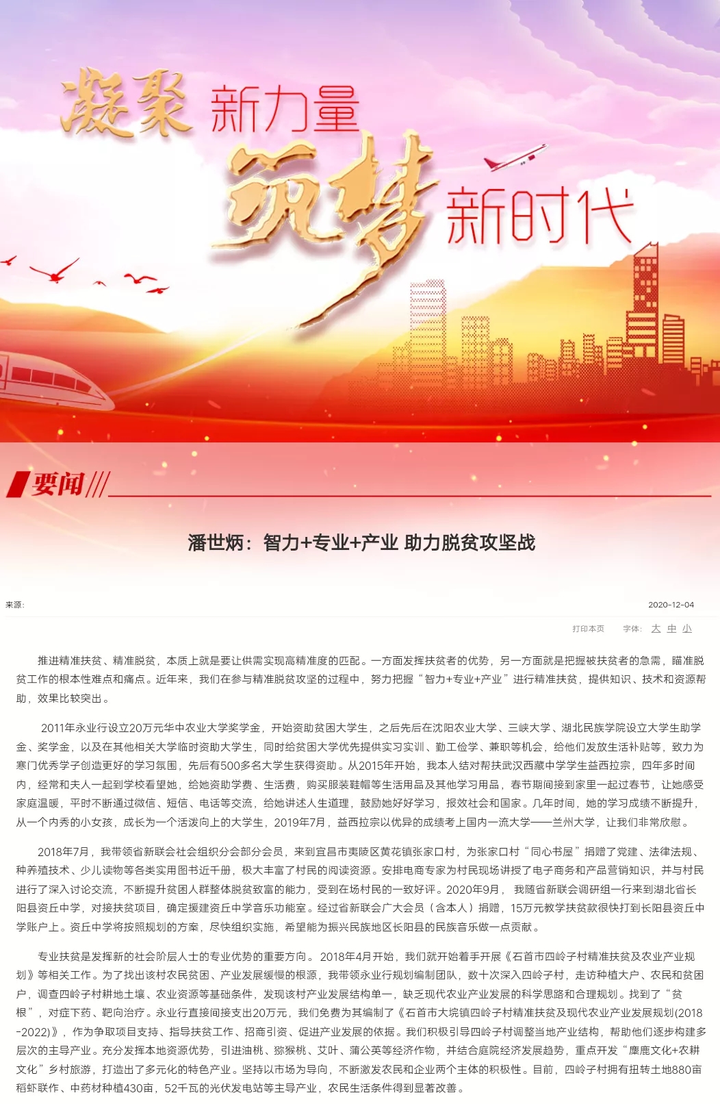 2020年12月4日,湖北省政协委员、省政府参事、永业行董事长潘世炳结合自身扶贫工作体会,撰写了《智力+专业+产业 助力脱贫攻坚战》,获中央统战部网站全文刊载。