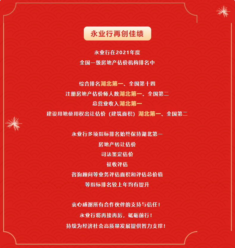 2022年3月30日,中国房地产估价师与房地产经纪人学会发布了《关于发布2021年度全国一级房地产估价机构排名结果的公告》(中房学〔2022〕9号),公告显示永业行在全国952家一级房地产估价机构中名列前茅!
