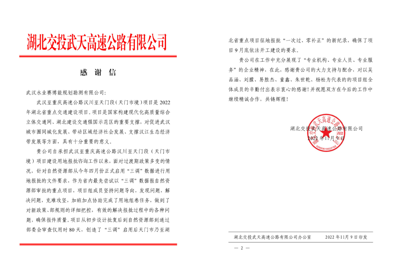 2022年11月,永业行陆续获湖北交投武天高速公路有限公司、大悟县自然资源和规划局致函感谢。