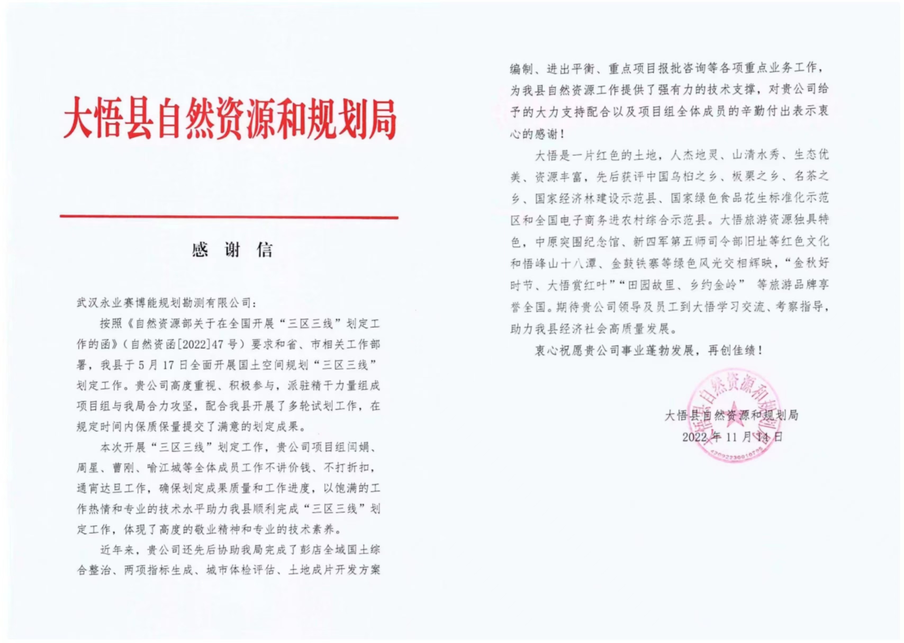 信中对我公司承担的大悟县国土空间规划“三区三线”划定工作表示高度肯定和衷心感谢,感谢信称我司“三区三线”项目组工作不讲价钱、不打折扣,通宵达旦工作,体现了高度的敬业精神和专业的技术素养。