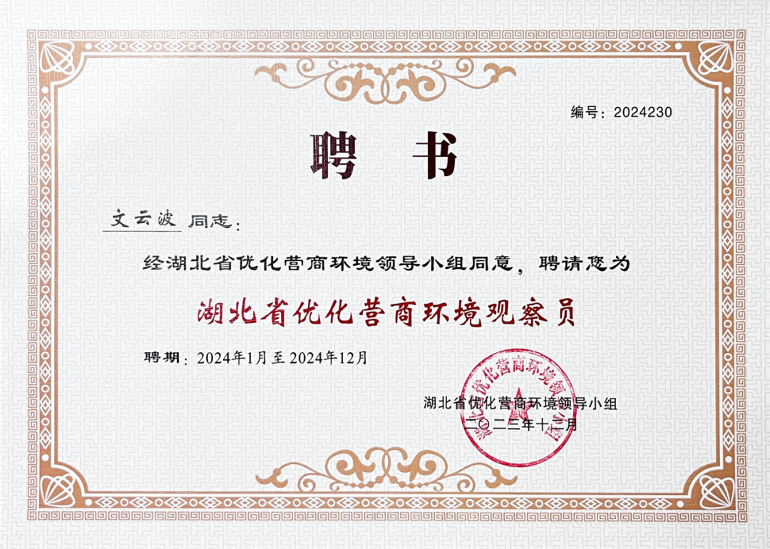 永业行入选湖北省优化营商环境监测点 文云波受聘观察员
